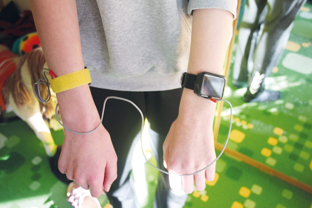Als Verbindung vom Arm mit der SmartWatch dienen ein kleines Kabel, ein Klettband, ein Stück Fahrradschlauch und ein Metallplättchen. Das Ergebnis jedoch ist verblüffend: Ein absolut perfektes EKG!
