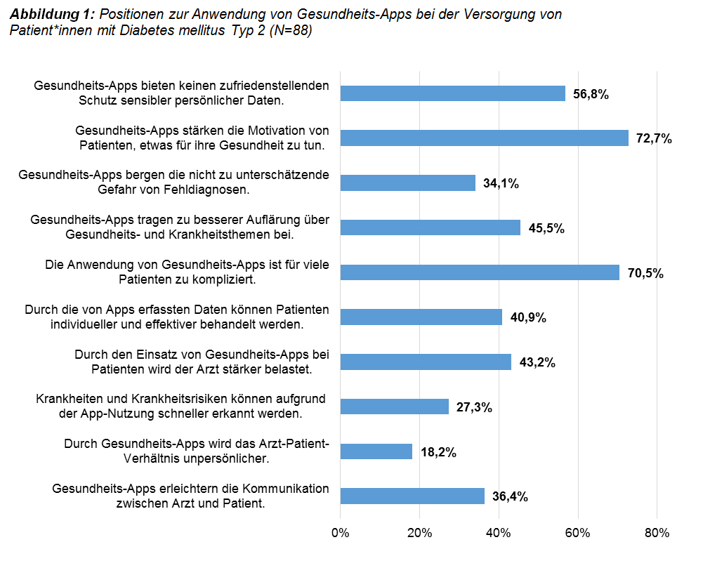 Eine Itembatterie zeigt, dass die Befragten sowohl Chancen als auch Risiken bei der Anwendung von Gesundheits-Apps in der Versorgung von Menschen mit T2D sehen. Die Mehrheit der Befragten betrachtet die Steigerung der Motivation zu gesundheitsförderlichem Verhalten als besonders positiven Aspekt. Gleichzeitig bestehen Bedenken, dass die Nutzung der Apps zu kompliziert sein könnte, was zu Folgeproblemen führen könnte. Zudem äußert sich eine Mehrheit unzufrieden mit dem derzeit von den meisten Apps gebotenen Datenschutz. Nach allgemeiner Einschätzung der Befragten setzen die eigenen Patientinnen und Patienten mit T2D Gesundheits-Apps am ehesten zu Präventionszwecken (80 %) und zur Einhaltung eines gesundheitsförderlichen Lebensstils (77 %) ein. Des Weiteren schätzen die Anwendenden Monitoring- und therapeutische Funktionen, wie z. B. Dokumentation von Verlaufsparametern (57 %) sowie Erinnerungsfunktionen (49 %).