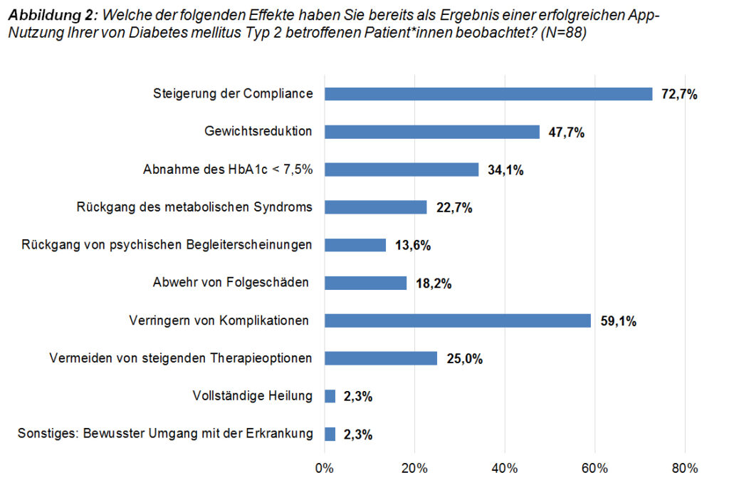 Die Befragten berichten von verschiedenen positiven Effekten für den Gesundheitszustand der Betroffenen, die mit einem funktionierenden App-Einsatz in Verbindung bringen. Neben der Steigerung der Compliance wird als Ergebnis der App-Nutzung eine Verringerung von Komplikationen wie z. B. Hypoglykämien geschildert, ebenfalls eine Gewichtsreduktion (z. B. BMI, Bauchumfang, Taillenumfang).