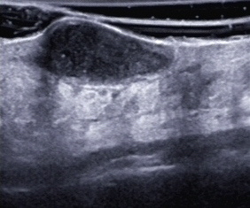 Eine erneute lokale sowie antibiotische Therapie führten zunächst zu einem Teilerfolg, jedoch wurde die Patientin bereits nach wenigen Wochen erneut vorstellig – es war wieder zu einer Abszedierung gekommen (sonografische Darstellung, s. Abb. 4–6)
