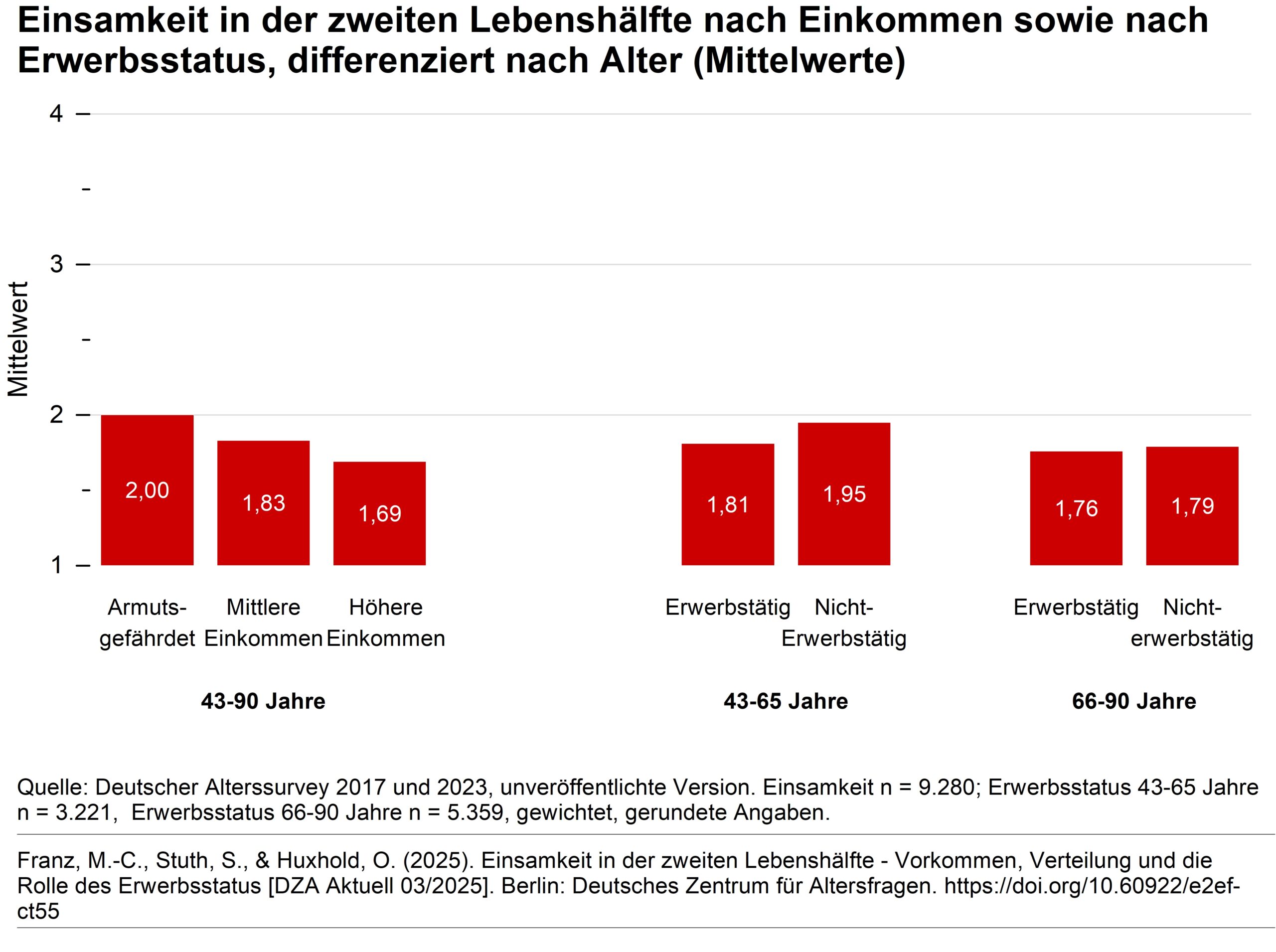 Substanzielle Unterschiede zeigen sich beim Einkommen. Personen, die als armutsgefährdet gelten, fühlen sich einsamer als Personen mit mittleren und höheren Einkommen. Ebenso deutlich sind die Unterschiede beim Erwerbsstatus: Erwerbstätige fühlen sich weniger einsam als Nicht-Erwerbstätige, allerdings nur im Erwerbsalter (43 bis 65 Jahre). Ab 66 Jahren, also dem üblichen Ruhestandsalter, gibt es keine signifikanten Unterschiede im Einsamkeitsempfinden zwischen Menschen, die einer Erwerbstätigkeit nachgehen und denen, die es nicht tun.