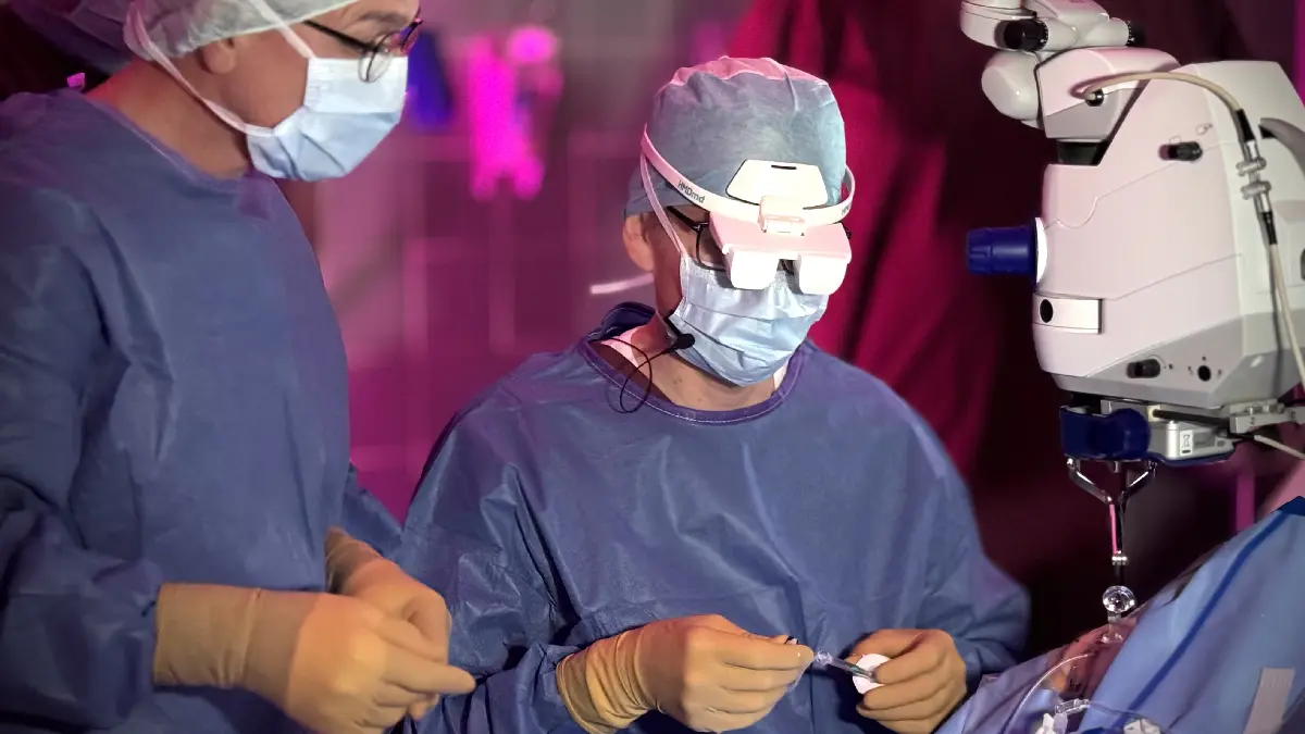 Bild: Prof. Dr. Siegfried Priglinger (rechts im Bild) während der Operation am LMU Klinikum, die im Rahmen des Kongresses VM Retina Meeting München live übertragen wurde. Foto: LMU Klinikum / Siegfried Priglinger