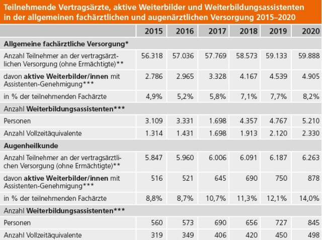 Ein Indikator für eine überdurchschnittliche ambulante Weiterbildung im Fach ist der Anteil der aktiv Weiterbildenden an allen Vertragsärzten ohne Ermächtigten (Abbildung 1): In der Augenheilkunde war 2020 rund jeder siebte ambulante Facharzt auch Weiterbilder, in der allgemeinen fachärztlichen Versorgung war es hingegen nur rund jeder zwölfte. Auch die Zahl der Weiterbildungsassistenten ist im Vergleich zu der Fachärztezahl in der ambulanten Versorgung in der Augenheilkunde deutlich höher.