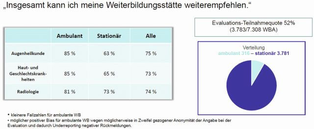 In Anbetracht der fachübergreifend eher geringen Assistentenzahl in ambulanter Weiterbildung wundert es nicht, dass diese Option unter jungen Medizinern oft nicht bekannt ist. Dabei gibt es zahlreiche weiterbildende Praxen und nicht krankenhausgebundene MVZ, die üblicherweise nach Arztzahl groß sind, operativ und oft auch belegärztlich tätig. So bilden die dem OcuNet Verbund angeschlossenen Zentren alle weiter und verantworten so zusammen mit anderen großen Praxen und MVZ die Qualifizierung der nachwachsenden Augenarztgeneration. Weiterbildungsassistenten geben ihren ambulanten Weiterbildungsstätten schon seit Jahren in Evaluationen gute Noten [5]. Auf dem ZI-Symposium berichtete der Chef der Ärztekammer Westfalen-Lippe für mehrere Fächer – darunter auch die Augenheilkunde – von einer im Vergleich zur stationären Weiterbildung höheren Weiterempfehlungsbereitschaft (Abbildung 2 [7]). Weiterbildungsassistenten – so ebenfalls  das übereinstimmende Ergebnis von Befragungen – schätzen insbesondere die planbareren Arbeitszeiten und die bessere Work-Life-Balance [6].