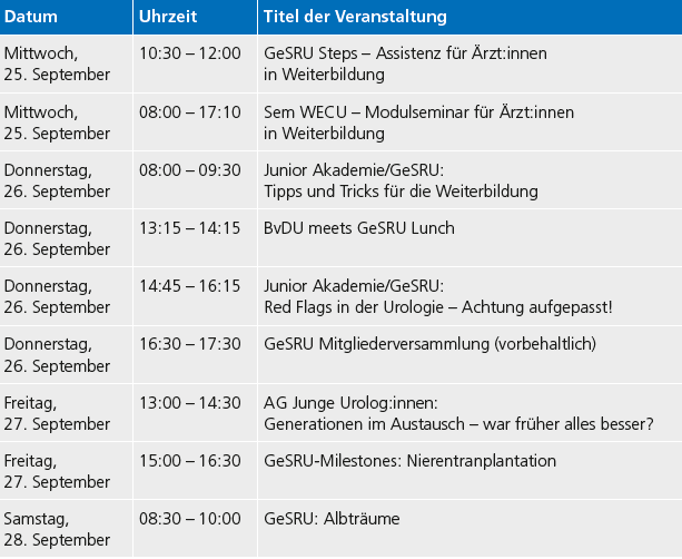 Wir geben euch in Tabelle 1 einen Überblick über das vielseitige und umfangreiche Angebot der GeSRU. Insbesondere für den urologischen Nachwuchs haben wir mit Freude ein buntes Programm zusammengestellt.