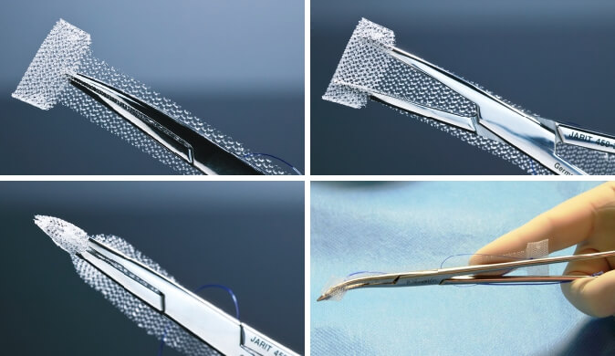 Wir begannen im Februar 2023, Patientinnen mit einer Belastungsharninkontinenz nach entsprechender urogynäkologischer Diagnostik einschließlich Urodynamik, ISIQ und VAS-Fragebogen, erfolgloser konservativer Therapie, entsprechendem Leidensdruck und Wunsch nach operativer Therapie mit dem Needleless System zu behandeln. Nach präoperativer Antibiose erfolgt zunächst die Infiltration eines Lokalanästhetikum suburethral sowie bds. paraurethral. Anschließend erfolgt eine ca. 2 cm lange Längsinzision im Bereich der vorderen Scheidenwand in Höhe der mittleren Urethra. Dabei ist zu bedenken, dass das Needleless Band 1,2 cm breit und somit 20 % breiter als herkömmliche Bänder ist (▶ Abb. 3). Mit einer Präparierschere wird nun die Scheide in Richtung 2:00 Uhr und 10:00 Uhr mobilisiert. Unbedingt sollte auch hier ausreichend Platz für eine freie Bandentfaltung geschaffen werden. Anschließend wird eine Overholt Klemme in die T-Tasche eingeführt und das Band fixiert (▶ Abb. 4). Die Klemme wird mit dem gefalteten Netz in den paraurethralen Raum platziert und durch Druckkraft in den inneren Obturatoriusmuskel eingebracht, bis die blaue Mittelmarkierungsnaht 1 cm tiefer in Bezug auf die Harnröhre liegt. Lösen der Klemme in der T-Tasche erfolgt durch Öffnen des Instrumentes und zurückziehen nach Wiederverschluss (▶ Abb. 5). Gleiches Vorgehen auf der kontralateralen Seite, bis sich die blaue Markierungsnaht in der Mittellinie befindet (▶ Abb. 5). Das Band soll am Ende spannungsfrei unter der Urethra liegen.