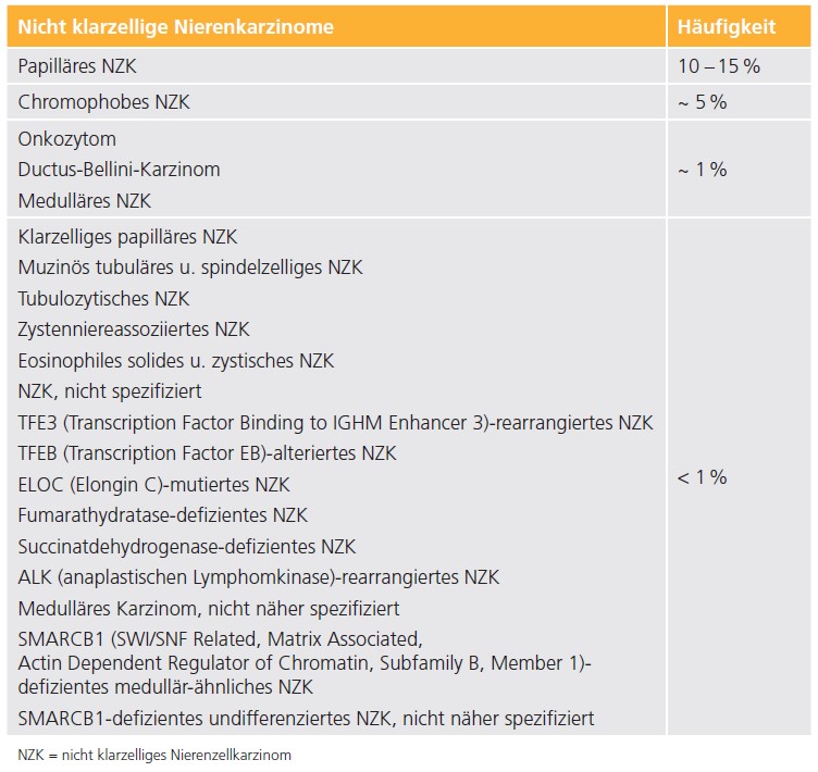 Nierenzellkarzinome (NZK) haben einen Anteil von ca. 85 % an Nierentumoren, wobei das klarzellige NZK mit einem Anteil von ca. 75–80 % die häufigste Entität ausmacht. Die nicht-klarzelligen Nierenzellkarzinome (nccRCC) haben einen Anteil von ca. 20–25 % und stellen histologisch und molekular mit über 20 Subentitäten eine heterogene Gruppe dar. Aufgrund der Seltenheit dieser Tumoren liegen nur unzureichende klinische Daten zur optimalen Therapiestrategie im fortgeschrittenen/metastasierten Stadium vor [1–3].