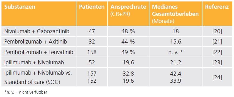 Eine einarmige Phase-II-Studie oder kleine randomisierte Studien mit ICI lassen vermuten, dass auch beim nicht klarzelligen NZK durch die Immuntherapie eine Verbesserung des Überlebens erreicht werden kann. In einer Phase-II-Studie mit Cabozantinib und Nivolumab lag das Gesamtansprechen bei 47,5 %, das PFS bei 12,5 Monaten und das mediane Gesamtüberleben bei 28 Monaten, wobei besonders papilläre NZK zu profitieren schienen [20]. Ähnliche Daten ergab eine Studie mit Pembrolizumab und Axitinib im Rahmen der einarmigen NEMESIS-Studie mit einem Gesamtansprechen von 44 % und einem medianen PFS von 10,8 Monaten [21]. In der KEYNOTE-B61- Studie zeigte die Kombination von Pembrolizumab mit Lenvatinib ein Gesamtansprechen von 49 % und ein medianes PFS von 18 Monaten. Die Überlebenswahrscheinlichkeit nach 12 Monaten lag bei 82 % [22]. Mit der Kombination Ipilimumab / Nivolumab wurde in der CheckMate-920-Studie ein Gesamtansprechen von 19,6 %, ein PFS von 3,7 Monaten und medianes OS von 21,2 Monaten erreicht. Patienten mit PD- L1-Expression sprachen besser an [23]. In einer kürzlich publizierten, randomisierten Studie mit Ipilimumab /Nivolumab versus Standard of Care (SOC; SUNNIFORECAST-Studie) bei 306 Patienten konnte ein Gesamtansprechen von 33 % vs. 20 % und eine signifikant verbesserte 12-Monats-Überlebensrate von 78 % vs. 68 % mit der ICI-Kombination gegenüber SOC (meistens TKI-Monotherapie) erreicht werden [24]. Besonders schienen hierbei Patienten mit einem CPS-Score (combined positive score) ≥ 1 zu profitieren. Eine Zusammenfassung der Studien beim nicht klarzelligen NZK mit ICI oder ICI/TKI-Kombinationen in der Erstlinie findet sich in ▶ Tabelle 2.